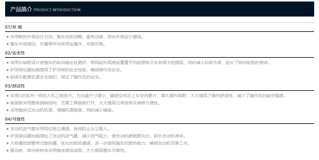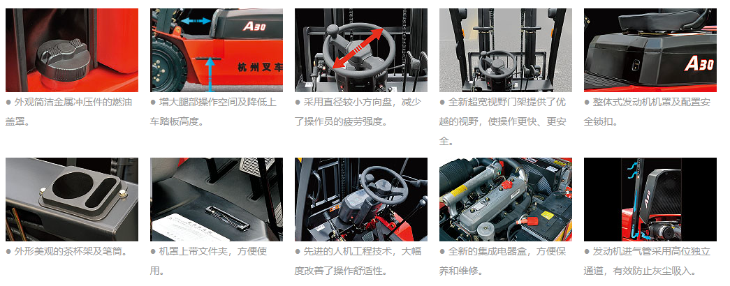 ● A系列是杭叉采用先進(jìn)技術(shù)、在原有產(chǎn)品基礎(chǔ)上,自主開發(fā)的全新系列內(nèi)燃平衡重式叉車,通過對(duì)外觀造型、安全性、舒適性及可靠性的全面升級(jí),使整車性能較原有產(chǎn)品有了大幅度提高。