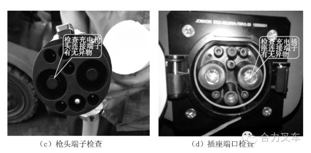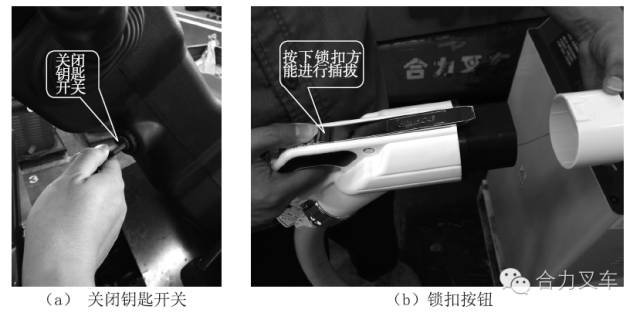 請(qǐng)選用合力指定的專(zhuān)用鋰電池充電設(shè)備進(jìn)行充電,并嚴(yán)格遵照所用充電設(shè)備的《使用維護(hù)說(shuō)明書(shū)》要求進(jìn)行操作?! りP(guān)掉鑰匙開(kāi)關(guān)后充電; ·請(qǐng)選擇在相對(duì)較安全的環(huán)境下充電(如避免有液體、火源等環(huán)境); ·充電設(shè)備周?chē)枧鋫浔匾陌踩珳缁鹧b置,以便在出現(xiàn)極端情況下可以進(jìn)行緊急滅火處理; ·充電前需確認(rèn)充電槍及充電插座里沒(méi)有粉塵、積水等異物,如有異物需將其清理完畢方可充電,否則會(huì)導(dǎo)致充電槍及充電插座接觸不良從而產(chǎn)生發(fā)熱甚至引起火災(zāi); ·不要修改或拆卸充電端口和充電設(shè)備,這樣可能導(dǎo)致充電故障,引起火災(zāi); ·充電結(jié)束后,不要以濕手或站在水里時(shí)去斷開(kāi)充電設(shè)備,因?yàn)檫@樣可能引起電擊,造成人身傷害; ·充電結(jié)束后,請(qǐng)關(guān)閉車(chē)輛充電端口保護(hù)蓋,避免充電口在車(chē)輛運(yùn)行過(guò)程中進(jìn)入異物,因?yàn)檫@樣會(huì)導(dǎo)致充電口損毀?! ぎ?dāng)電池電量低于20%時(shí),應(yīng)及時(shí)補(bǔ)充充電,嚴(yán)禁電池過(guò)放電; ·電池使用后應(yīng)立即充電,充電應(yīng)充滿(mǎn),但嚴(yán)禁過(guò)充電; ·為避免對(duì)充電設(shè)備造成破壞,請(qǐng)注意以下幾項(xiàng): a)不要在充電端口保護(hù)蓋打開(kāi)的狀態(tài)下關(guān)閉充電端口艙門(mén); b)不要用力拉或者扭轉(zhuǎn)充電電纜; c)不要使充電設(shè)備承受撞擊; d)不要在溫度高于55℃的環(huán)境下使用充電設(shè)備; e)禁止在充電設(shè)備有電流輸出時(shí)直接插拔充電槍?zhuān)@樣可能會(huì)導(dǎo)致電拉弧現(xiàn)象, 造成財(cái)產(chǎn)損失及人身傷害; f)不要把充電設(shè)備放在靠近加熱器或者其他熱源的地方?! 〕潆姴僮鞑襟E: 步驟一:充電準(zhǔn)備 (1)確保待充電車(chē)輛鑰匙開(kāi)關(guān)處于關(guān)閉狀態(tài),即整車(chē)不帶電,如圖(a)所示; (2)從充電設(shè)備上取下充電槍頭(注意:充電槍頭上集成有按鈕鎖扣如圖(b)必須按下才可進(jìn)行正常拔插操作),檢查充電槍及車(chē)輛端的鏗電池充電插座,確保端口內(nèi)沒(méi)有水或外來(lái)物,及金屬端子沒(méi)有生銹或者腐蝕造成的破壞或者影響,如圖(c),(d)所示;